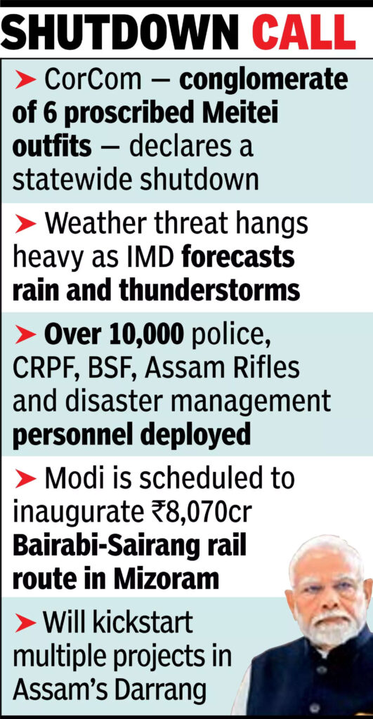Modi is also expected to interact with people displaced by the Meitei-Kuki conflict and still living in relief camps. An official statement said Modi’s planned engagements were “in line with his commitment to inclusive, sustainable and holistic development of Manipur”.Over 260 people were killed and 60,000-odd displaced in the cycle of violence since May 2023, leading to N Biren Singh resigning as CM on Feb 9. President’s rule was clamped on Feb 13.Amid enthusiasm about the PM’s maiden visit in 29 months of ethnic tensions, the militant CorCom – a conglomerate of six proscribed Meitei outfits – struck a discordant note by declaring a statewide shutdown to protest what it terms “a proxy war” by the Centre. The organisation had called for a boycott of each of PM Modi’s previous visits.Weather remains the other threat, with the administration keeping a wary eye on the skies amid IMD’s forecast of heavy rain and thunderstorms coinciding with the prime ministerial visit.Over 10,000 police, CRPF, BSF, Assam Rifles and disaster management personnel have been deployed at both venues as part of the multi-layer security designed to ensure a hitch-free trip for the PM, sources said.“Peace is not only the absence of violence but also presence of trust, harmony and reconciliation. PM’s visit will pave the way for peace, normalcy and accelerated growth,” chief secretary Puneet Kumar Goel said. “Manipur is not just a border state but a central pillar of India’s Act East Policy, a gateway to Southeast Asia and a proud guardian of India’s diversity.”In Mizoram, Modi is scheduled to inaugurate the Rs 8,070-crore Bairabi-Sairang rail route connecting state capital Aizawl with the expansive Indian Railways network. He will also flag off three new express trains, including a Rajdhani Express.Another project in the pipeline is the Chhimtuipui river bridge on the Lawngtlai-Siaha route, meant to provide all-weather connectivity and reduce travel time by two hours. The project is part of the strategy to support cross-border commerce under the Kaladan Multimodal Transit framework.Modi will travel to Assam from Manipur to participate in events commemorating 100th birth anniversary of Bharat Ratna Bhupen Hazarika.