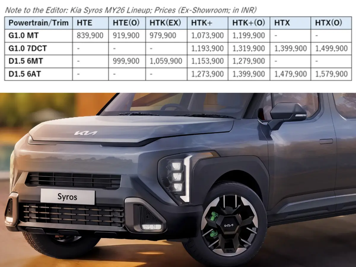 The Kia Syros now gets more affordable with its Model Year 2026 update. The sub-4 metre SUV lineup is now available at a starting price of Rs 8.39 lakh, with automatic variants becoming more accessible. The 2026 Kia Syros features slightly improved styling, more features and a revised variant lineup. It is now offered in four new trims – HTE, THE (O), HTK+ (O) and HTX (O), while the HTK, HTX+ and HTX+ (O) trims have been discontinued.