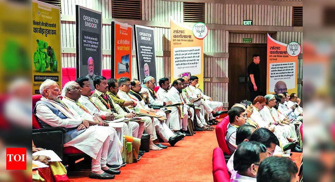 NEW DELHI: The BJP parliamentary party on Sunday passed a resolution hailing PM Narendra Modi for the GST reforms which, the party said, are citizen-friendly and have the potential to make India “self-reliant”.“Eight years ago, under the decisive leadership of PM Narendra Modi, India embraced the Goods and Services Tax, fulfilling the vision of ‘One Nation, One Tax’. What once was a cumbersome tax regime of VAT and multiple taxes is now replaced by a unified market that has brought fairness, simplicity and strength to our economy,” the party said in the resolution, which was presented by commerce and industry minister Piyush Goyal.The resolution was adopted by the party during a two-day workshop beginning Sunday, ahead of the VP polls, at the GMC Balayogi Auditorium in the Parliament complex. Modi attended the workshop for BJP MPs, where a resolution was passed lauding the govt for the GST reforms, ahead of the party’s nationwide outreach to highlight its benefits. Modi, who was seated in the last row, remained in the midst of the MPs and attended different sessions on the first day of the “Sansad Karyashala”. Sources said the PM gave suggestions and shared his views while attending meetings of MPs divided into different groups.At a meeting which saw members of a few parliamentary committees being brought together, he asked the MPs to take an active part in discussions and in reading and preparing reports.Union parliamentary affairs minister Kiren Rijiju said MPs from the BJP’s allies will join the meeting on Monday, and Modi will address the governing alliance members.NDA MPs are also likely to participate in a mock polling exercise in preparation for the Sept 9 VP election.Leading party netas, including Union ministers Amit Shah, Rajnath Singh and J P Nadda, attended the programme aimed at helping MPs contribute effectively inside and outside Parliament.Several members highlighted that Modi had chosen to sit in the last row, like an “ordinary” party member, when he arrived. Sharing a picture of Modi, Gorakhpur MP Ravi Kishan said, “This is BJP’s strength that everyone here is a karyakarta (worker).”Modi later said on X, “Attended the ‘Sansad Karyashala’ in Delhi. MP colleagues from all over India and other senior leaders exchanged valuable perspectives on diverse issues.” He added, “In our party, platforms like ‘Sansad Karyashala’ are important because they are great forums to learn from each other and deliberate on how we can serve people even better.”The different sessions during the two-day workshop will be devoted to a host of issues, including the work of parliamentarians and the highlights of the govt’s achievements. The venue was replete with materials showcasing the benefits of the GST reforms and other achievements, including Operation Sindoor.