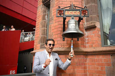 MANCHESTER, ENGLAND – JULY 25: Ex Lancashire and Pakistan player Wasim Akram rings the bell ahead of Day Three of the 4th Rothesay Test Match between England and India at Emirates Old Trafford on July 25, 2025 in Manchester, England. (Photo by Clive Mason/Getty Images)