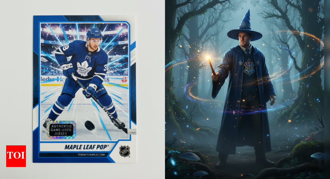 “Turn me into a Toronto Maple Leafs hockey player on a glossy trading card, mid-action skating pose, ice rink lights reflecting off helmet and stick, motion blur on puck, dynamic energy lines, stylized modern sports card design.”