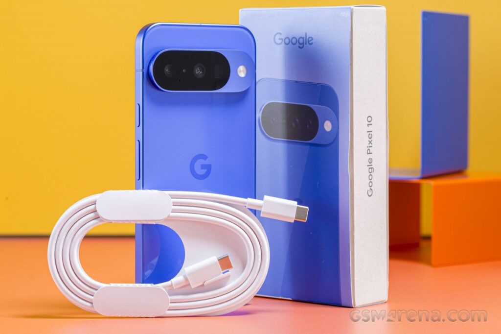 Unsurprisingly, the Pixel 10 ships in a recycled paper box with nothing more than a USB-C cable.