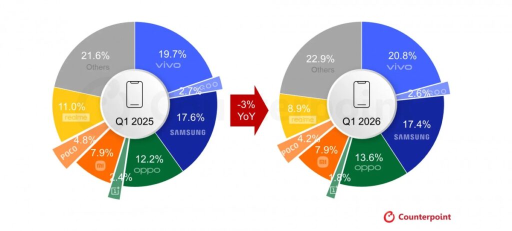 According to a new report by Counterpoint Research (CR), the Indian smartphone market between January and March had its weakest quarter in six years. Shipments fell 3% compared to the first quarter of last year.