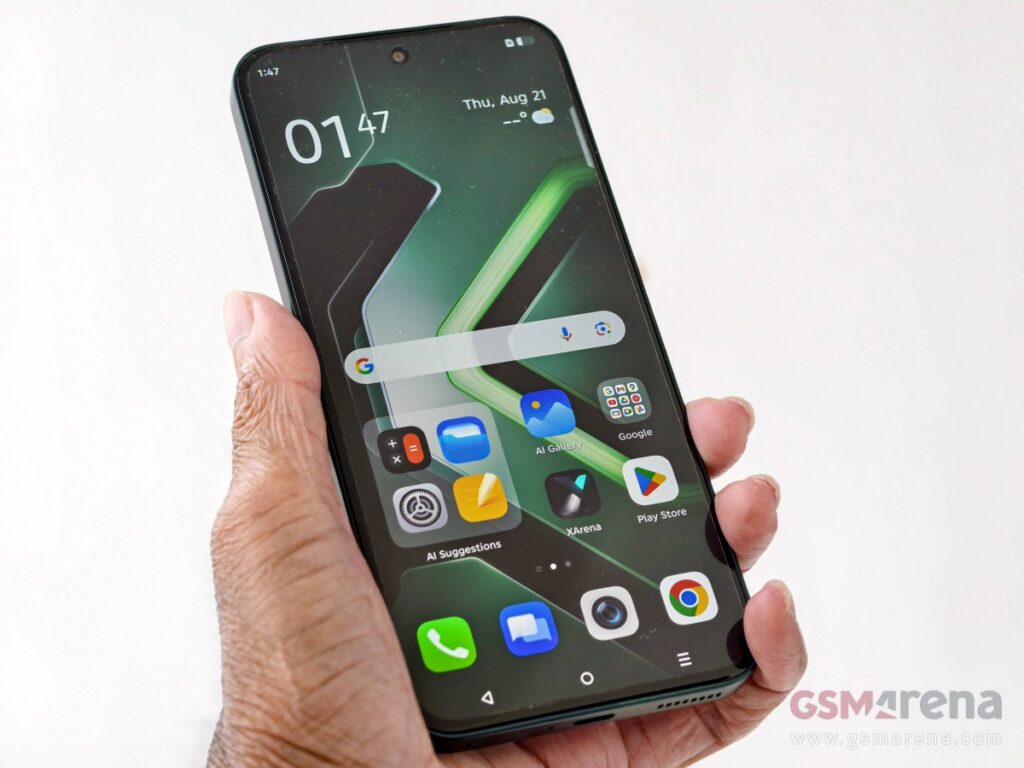 The Infinix GT 30 is built around a 6.78″ LTPS AMOLED display having 2,720×1,224-pixel resolution and 4,500 nits of peak brightness. The panel has a 144Hz refresh rate, up to 240Hz touch sampling rate, and 10-bit color depth. Moreover, the display is protected by Gorilla Glass 7i and supports the Always On Display function, which, in reality, isn’t always on since the screen only shows information when you tap it. We find this misleading and would like Infinix to fix it with a software update.