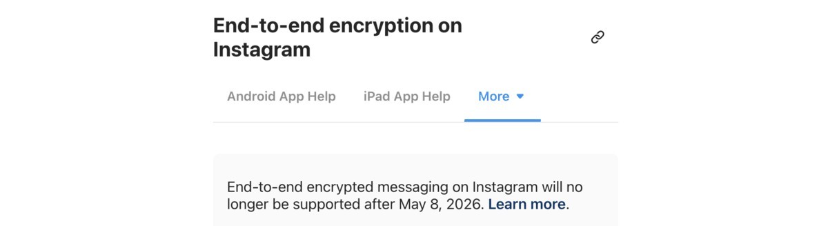 As you’d expect in trying to avoid a ton of online fuss regarding this matter, Instagram hasn’t announced this in a press release or blog post. Instead, it’s quietly updated its help section to read that E2EE will no longer be supported after May 8.