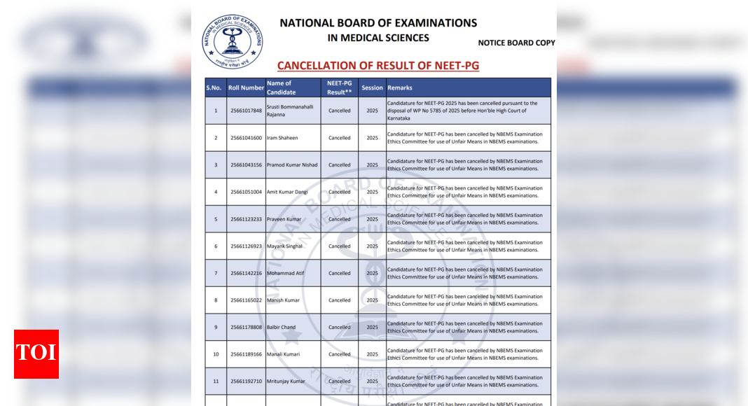 Alongside NEET PG candidates, the NBEMS has also cancelled the candidature of 11 students who appeared in the Foreign Medical Graduate Examination (FMGE) between 2021 and 2025. These candidates were similarly found to have used unfair means during the exam.The FMGE, which allows foreign-trained medical graduates to obtain a licence to practice in India, reported a sharp decline in pass percentage this year. The June 2025 session recorded a pass rate of 18.61%, down by nearly 11% points from the previous year. Out of 37,207 registered candidates, only 6,707 managed to qualify.The NBEMS has reiterated its commitment to maintaining the integrity of medical entrance and licensure examinations, warning that strict action will continue against any candidate found compromising the fairness of the assessment process.