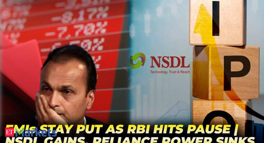RBI holds repo rate at 5.5%, keeping EMIs steady for now as inflation hits a 77‑month low. Markets close lower with rate‑sensitives, IT, and pharma under pressure. NSDL rallies 17% on debut, while Reliance Power extends its crash amid ED scrutiny.