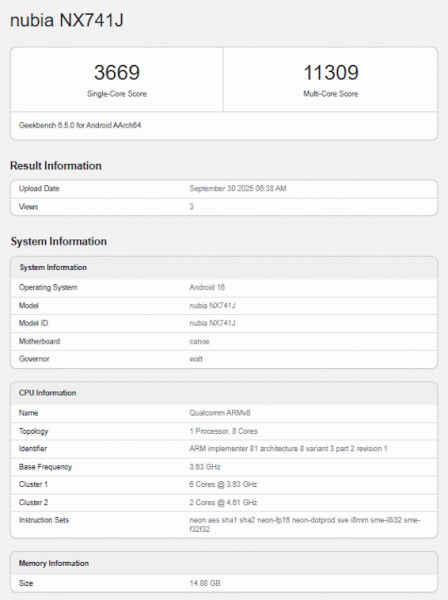 With the Snapdragon 8 Elite Gen 5 chip now officially unveiled, Android makers are set to unveil a plethora of flagships armed with the latest flagship SoC. Nubia is one of them, and its Z80 Ultra (NX741J) has now emerged in a Geekbench listing. The device is equipped with the SD 8 Elite Gen 5 chip and scored an impressive 3,669 single-core points and an 11,309 multi-core score. The phone is also armed with 16GB RAM and boots Android 16.