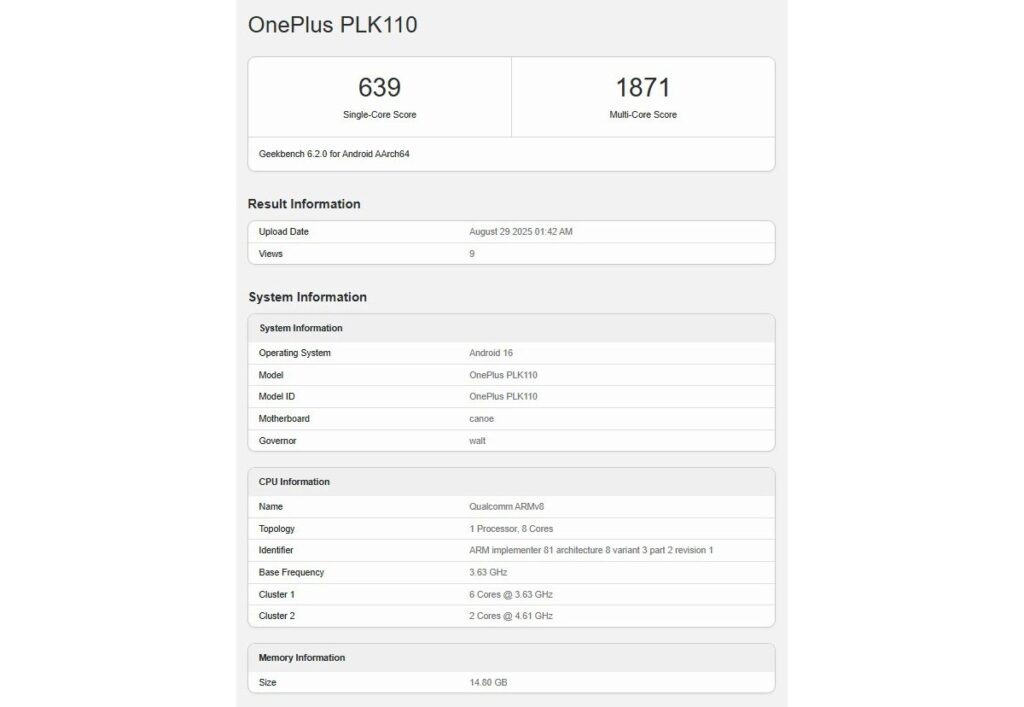 A OnePlus phone with the model number PLK110 has run Geekbench earlier today, and since it’s powered by the upcoming Qualcomm Snapdragon 8 Elite 2, it’s most likely the OnePlus 15.