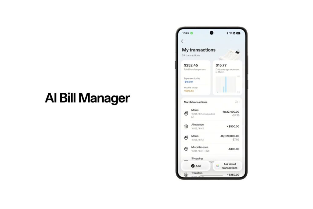 The AI Mind Space introduced with ColorOS 16 now supports AI Bill Manager, which can automatically extract and record key spending details from digital invoices and billing information. To use it, you simply need to enable AI Mind Space by pressing the Snap Key or using a three-finger swipe after making a payment on your phone.