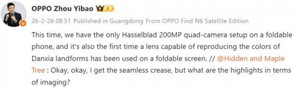 The employee also said that the Oppo Find N6 will be the only folding smartphone to come with a Hasselblad-tuned 200MP quad-camera setup. Furthermore, the Find N6 will be the first foldable to feature Oppo’s Danxia lens, with the Weibo post confirming the existence of a Find N6 Satellite Edition.