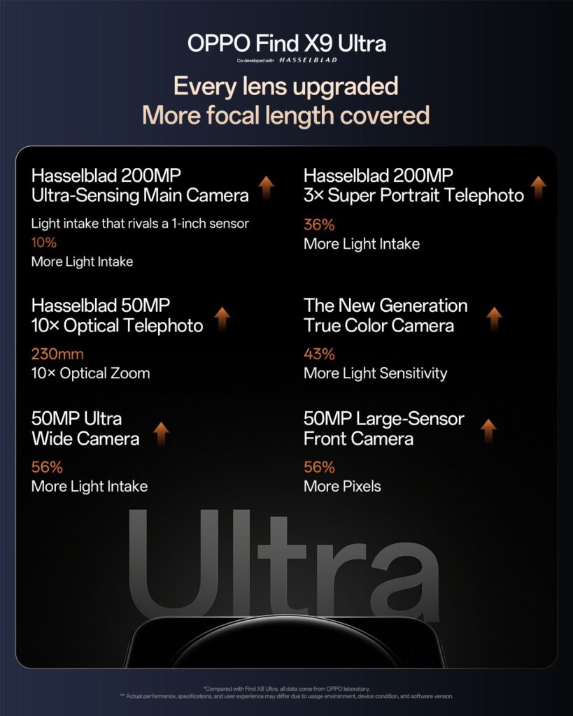 It will feature a 200MP primary sensor with an almost 1-inch size, said to deliver 10% better light intake than the Find X8 Ultra. The phone will also include a 200MP periscope telephoto camera with 3x optical zoom, claimed to offer 36% improved light intake over its predecessor.