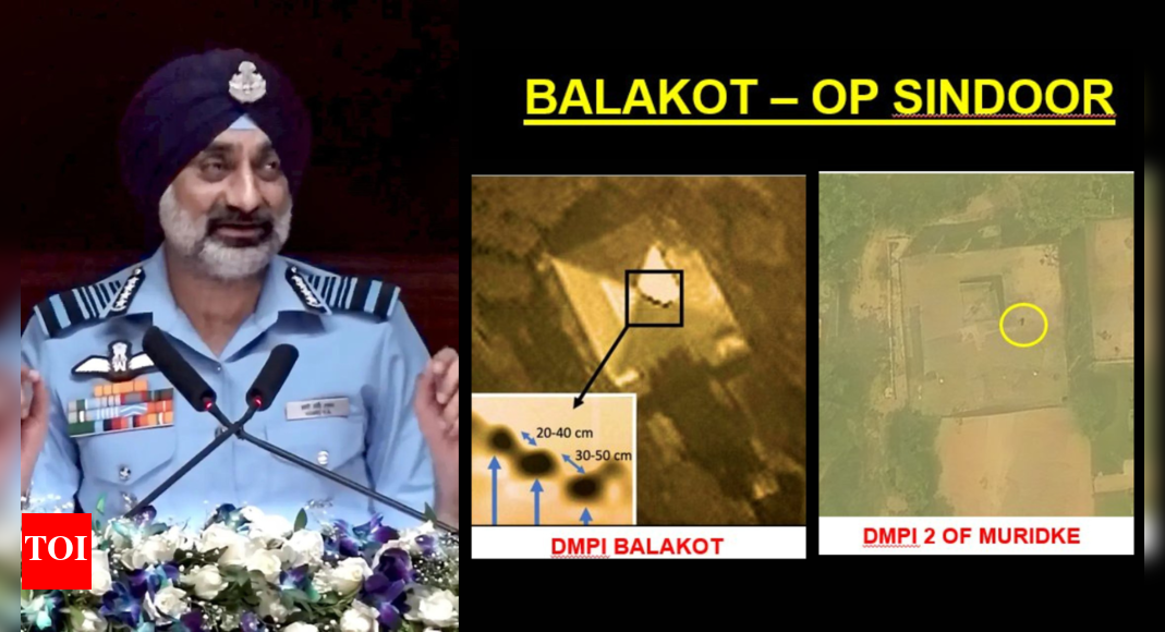 NEW DELHI: Haunted by the “ghosts of Balakot”, IAF chief Amar Preet Singh on Saturday came fully armed with more visual proof of the precision airstrikes carried out deep inside Pakistan during Operation Sindoor, showcasing the extent of damage inflicted on key military and terror infrastructure. From high-value airbases to the headquarters of ISI-backed terror outfits, the strikes, conducted in retaliation to the Pahalgam killings, demonstrated India’s ability to hit strategic targets with pinpoint accuracy, well inside enemy territory.“I’m very happy that this time we were able to take care of that ghost of Balakot that we were able to tell the world what we have achieved,” the IAF chief remarked.The evidence included images and videos of the destruction of Pakistan’s Nur Khan Airbase in Rawalpindi, the flattening of Jaish-e-Mohammed’s command centre in Bahawalpur, and crippling damage to Lashkar-e-Taiba’s headquarters in Muridke. The IAF also presented proof of severe hits on the Rahim Yar Khan, Sukkur, and Bholari airbases.