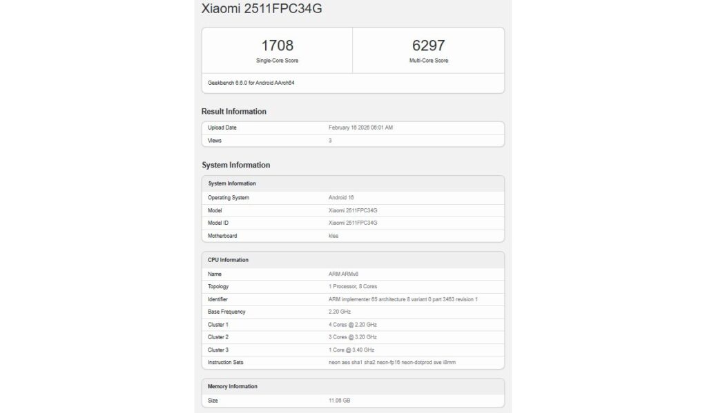 Today, the Poco X8 Pro has been spotted in the Geekbench online database, because a prototype has run the benchmark. As you can see from the screenshot below, it managed a single-core score of 1,708 and a multi-core score of 6,297.