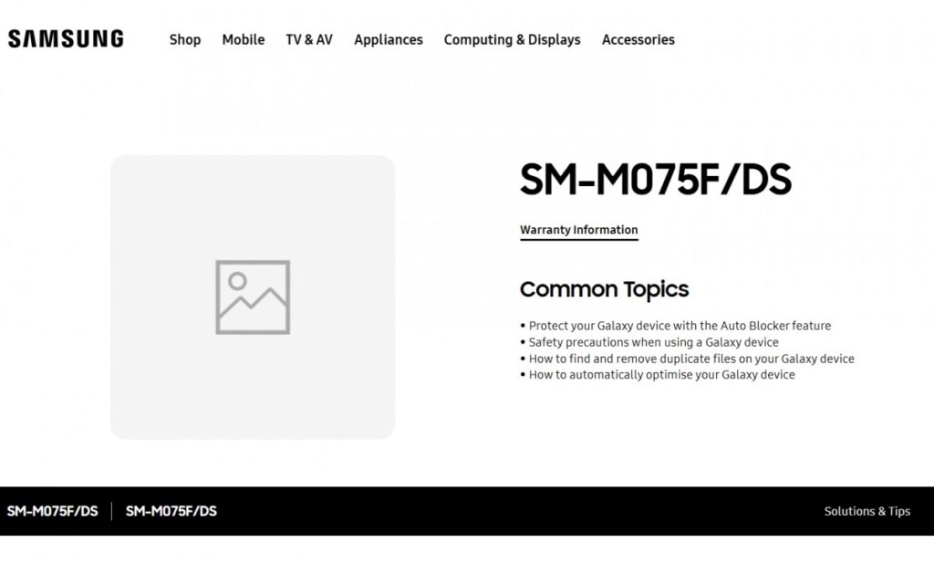The support page for a smartphone with model number SM-M075F/DS has gone live on the Samsung India site. While the listing doesn’t reveal any details, it does suggest that the phone could launch soon.