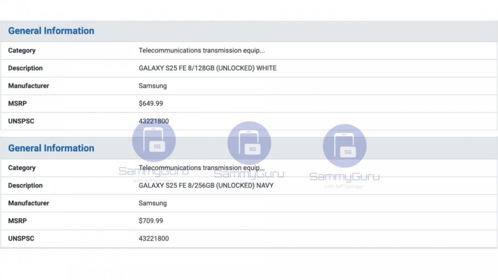 They show the phone priced at $649.99 with 128GB of storage, and $709.99 with 256GB. Both of these variants have 8GB of RAM, and it seems like the US at least won’t be getting the S25 FE with 512GB of storage.