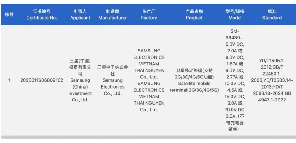 A Samsung smartphone with the model number SM-S9480 has been listed on the China 3C certification website. The listing reveals that the device will support up to 60W fast charging.