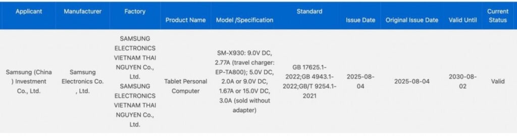 Now, the Galaxy Tab S11 Ultra has been certified by 3C in China, with the model number SM-X930. It will support 45W wired charging as revealed before.
