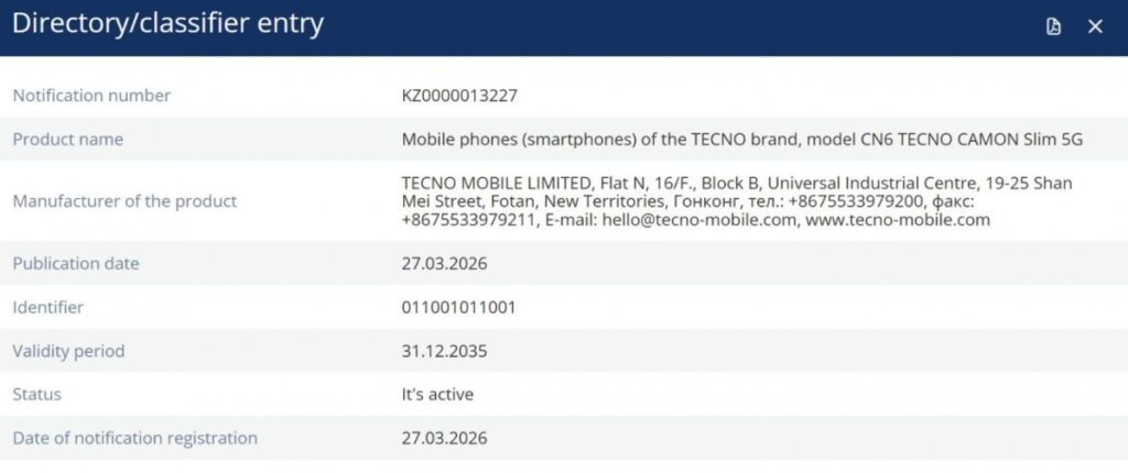 After the Spark Slim and Pova Slim from September 2025, Tecno is now working on another Slim device – the Tecno Camon Slim. This has been certified by the EEC. The certification reveals 5G support as well as the model number CN6.