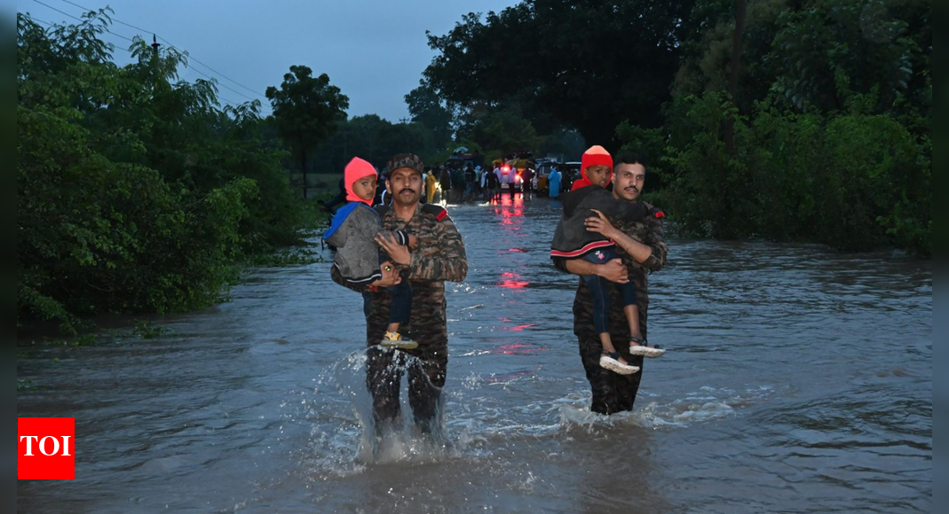 HYDERABAD: A person died when the wall of his house collapsed and another went missing following heavy rains that lashed Kamareddy, Medak and other districts of Telangana on Wednesday.The torrential downpour inundated low-lying areas and paralysed normal life across the northern parts of the state.Kamareddy bore the brunt of the deluge, with Argonda receiving an unprecedented 418.3 mm of rainfall between 8.30 am and 9 pm on Wednesday. Akkapur in Nirmal district followed with 302.5 mm, while several areas in Medak, Kamareddy, and Nirmal recorded between 200 and 300 mm of rain, according to the Telangana Development Planning Society.The collapse-related death was reported from Kamareddy, where the victim, a Registered Medical Practitioner (RMP), was trapped under the debris. In another case, a person stranded in floodwaters remained missing.Officials said more than 500 people were rescued and shifted to safer places, while arrangements were made to provide food to around 1,000 displaced persons. Nearly 1,071 residents are expected to be evacuated as rescue work continues.In Medak district, over 440 people were relocated after floods marooned several colonies. National Highway 44 was blocked for nearly 30 km in Kamareddy due to overflowing streams, disrupting traffic flow.Train services were also hit, with the South Central Railway cancelling or diverting several services.The State Disaster Response Force (SDRF) rescued nine people trapped in floodwaters at Annasagar in Kamareddy. In Rajanna-Sircilla, five cattle herders who had crossed a project area near Nirmal were stranded; while one person went missing, four awaited rescue. Drones were deployed in Upper Manair Project to deliver food packets and assist operations.The Indian Army was pressed into service in Medak, where flood relief columns with specialised boats, medical teams and engineering task forces launched operations in coordination with civil authorities, the NDRF and SDRF.Union minister of state for home Bandi Sanjay Kumar sought defence minister Rajnath Singh’s intervention to deploy IAF helicopters for rescuing 30 people stranded in Kamareddy and Rajanna-Sircilla districts. Singh responded positively, and officials at Hakimpet Air Force Station in Hyderabad were asked to mobilise choppers.Chief minister A Revanth Reddy directed chief secretary K Ramakrishna Rao to intensify relief operations with the support of NDRF and SDRF. Senior IAS officers will be appointed as special officers in flood-hit districts to supervise operations. A 24/7 control room has been set up at the Secretariat to monitor the situation.State Revenue Minister Ponguleti Srinivas Reddy instructed officials to create a breach in a canal running parallel to the Pocharam dam in Medak to release excess water. Ministers assured that measures were being taken to minimise loss of life and property.Meanwhile, the India Meteorological Department (IMD) issued a Red Warning, predicting very heavy to extremely heavy rainfall in isolated areas of Medak, Kamareddy, and neighbouring districts till Thursday morning.With schools shut in Rajanna Sircilla, Khammam, Medak, Nirmal, Adilabad, and Kumuram Bheem Asifabad, authorities advised residents in vulnerable areas to remain alert as rescue and relief efforts continue.