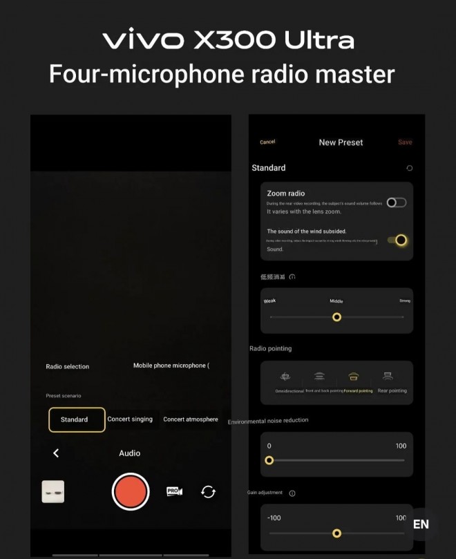 Below is a screenshot Boxiao shared from the X300 Ultra’s new camera app. The phone will be able to capture audio directionally, tune recording to the phone’s front or back, have noise reduction (from 0 to 100%), and even gain adjustment (from -100 to 100), which is something of a pro feature.