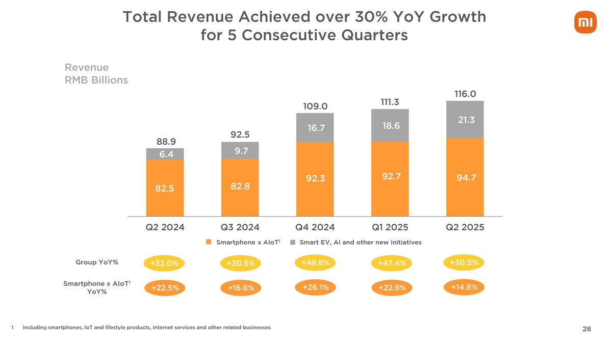 Xiaomi follows up on its record-setting Q1 with a similarly strong Q2 result this year. Total revenue for the Xiaomi group reached a record high of CNY 116 billion, which is a 30.5% increase compared to the second quarter last year. The smartphone business remains Xiaomi’s biggest segment, followed by IoT and Lifestyle products, but the combined Smart EV, AI and Other New Initiatives segment is growing quickly.