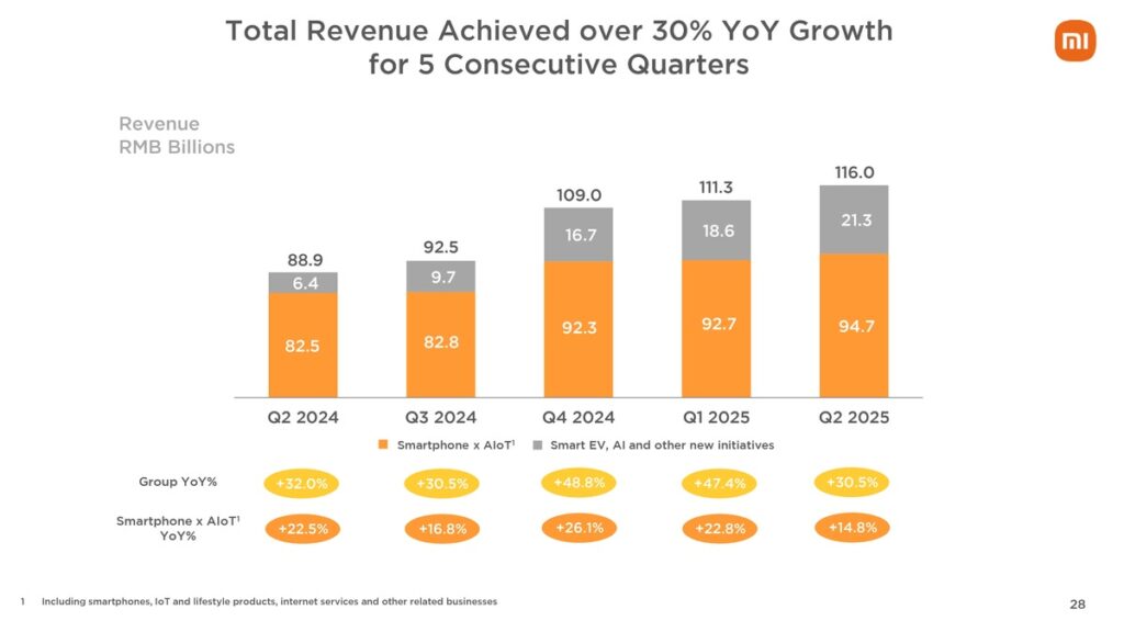Xiaomi follows up on its record-setting Q1 with a similarly strong Q2 result this year. Total revenue for the Xiaomi group reached a record high of CNY 116 billion, which is a 30.5% increase compared to the second quarter last year. The smartphone business remains Xiaomi’s biggest segment, followed by IoT and Lifestyle products, but the combined Smart EV, AI and Other New Initiatives segment is growing quickly.